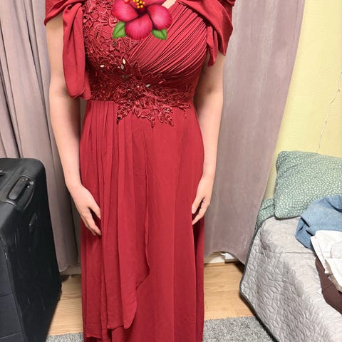 Stilfull festkjole i burgunder med glitter og chiffon.
