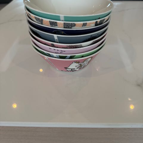 Arabia Mummi servise bestående av kopper og skåler med fargerike motiver fra Mummitrollet. Produktene har ulike fargekombinasjoner og illustrasjoner, laget i keramisk materiale. Passer til daglig bruk i kjøkken og spisestue.