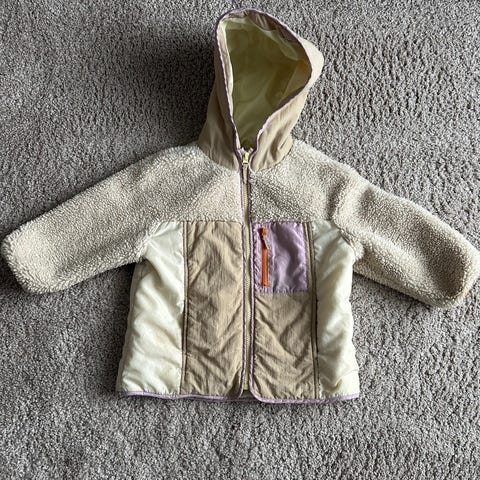 Zara jakke for barn i størrelse 110, farge beige. I godt stand. Jakken er designet for jenter. Den har hette og glidelås foran, med en kombinasjon av mykt stoff og glatte paneler.