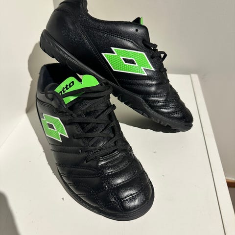 Lotto fotballsko i svart farge, størrelse 40. Skoene har knotter på yttersålen for bruk på gressbaner. Brukt en gang.