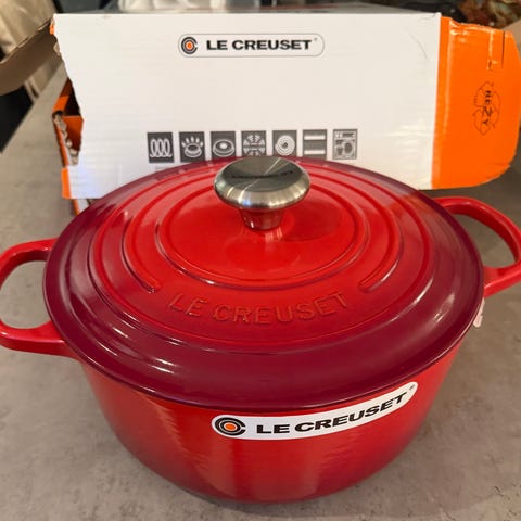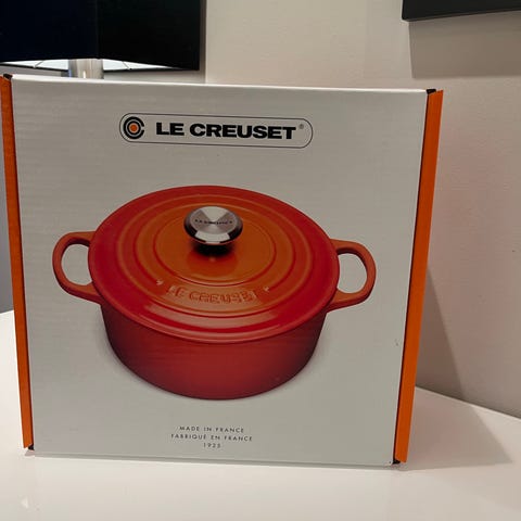 5 liters støpejernsgryte fra Le Creuset. 24 cm i diameter. Farge volcanic. Blir aldri brukt her (tror den er brukt én gang) og er som ny. Eske og liten infobok om bruk er med.