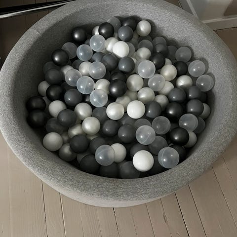 Grå ballbinge fra Jollyroom med både hvite, grå og pastellgrønne baller. (Ekstra mange baller)