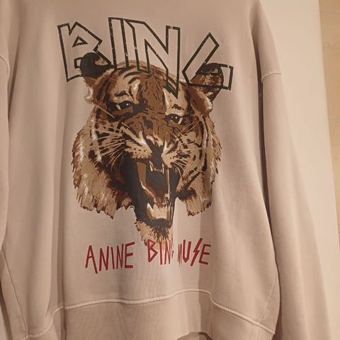 Harvey Sweatshirt fra Anine Bing. Vintage-inspirert hettegenser i en gråhvit farge med gråblå Anine Bing Sport-logo foran. Oversized fasong og fallende skuldersøm. "Slitte" partier runde hette, lommer og i vrangborder for en vintage look.