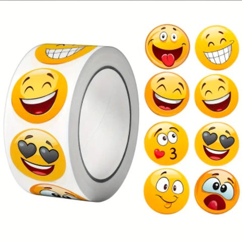 Stor rull med 500 morsomme og uttrykksfulle smilefjes-klistremerker i flere varianter. Perfekt for gaveinnpakning, skole, kontor, hobby og DIY-prosjekter. Gir en hyggelig og leken detalj på alt fra pakker til notatbøker.