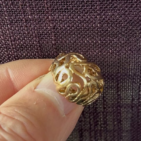 14 k gull, stemplet 585 ,kjøpt i Norge, trolig Mestergull. Pent mønster med stjerne- slip i midten, som gir innttykk av sten.