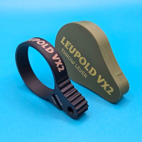 ℹ️ 3D-printet Throw Lever for Leupold VX-5HD, og Leupold VX-6 Gen1. (Begge har Ø41.4mm zoomring) Denne er slankere enn mine opprinnelige utgaver. Tynnere ring, og kun 9.5mm bredde for et slankest mulig utseende påmontert. Se bilde for sammenligning side-om-side. Innstøpt messinginnsats gir solid skrueanker. Rustfri sekskantskrue M3x8 følger med.