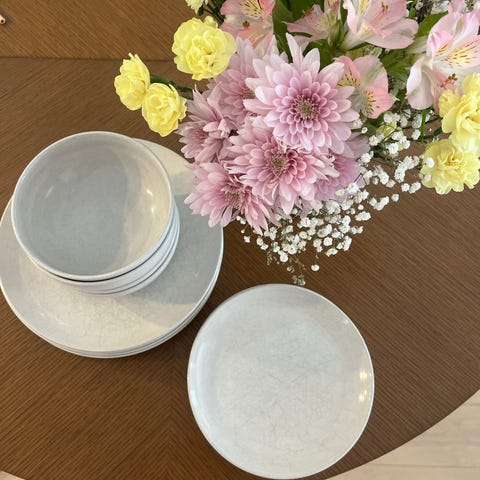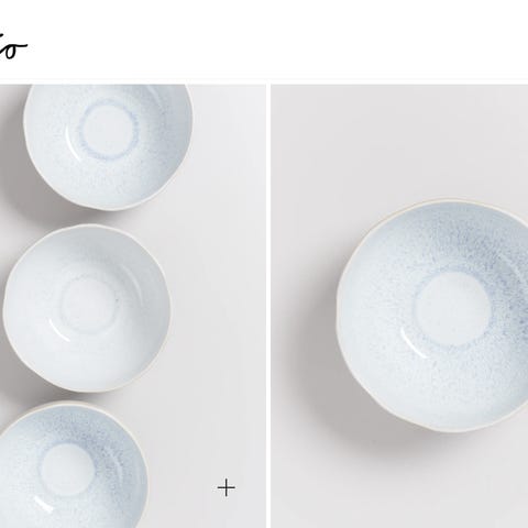 Keramikkservice bestående av 7 produkter: middagstallerken, 2 varianter av frokot/salat tallerken, suppebolle, liten blågrå skål, og minibolle.