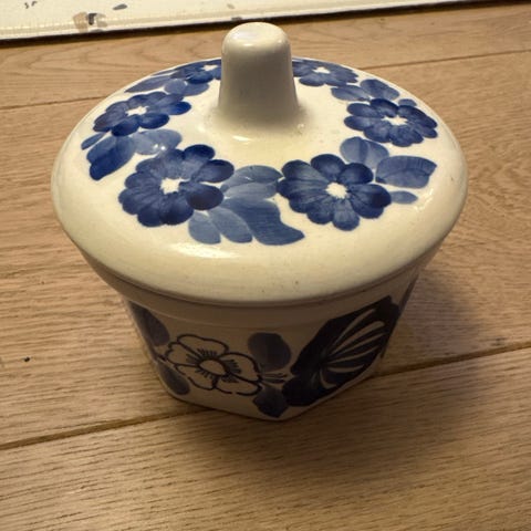 Mønstret krukke i blått blomster motiv med hvitt lokk. H 7 cm u/lokk. 9cm m/lokk og diamanter 9 cm. Indre diameter 7,5cm.