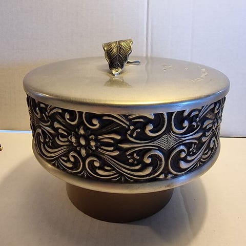 Pent og solid tinnskrin med lokk, antatt fra ca. 1960-tallet (rundt 60 år gammelt). Skrinet har et klassisk, dekorativt relieffbånd rundt siden.