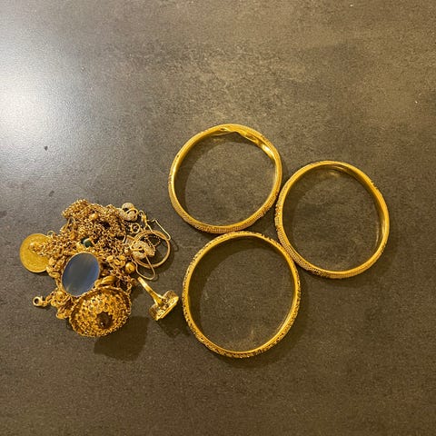 Selger et nydelig smykkesett i 22 karat gull, bestående av halskjede og matchende øredobber.