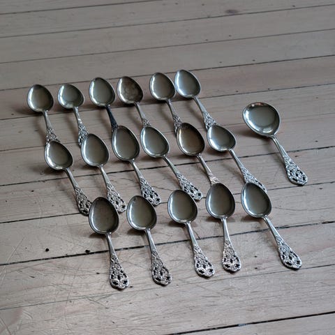 Norsk sølvplett, mønster Line. Sju teskjeer og fire koldgafler. To merket HS 60 gr, resten TK 60 gr.