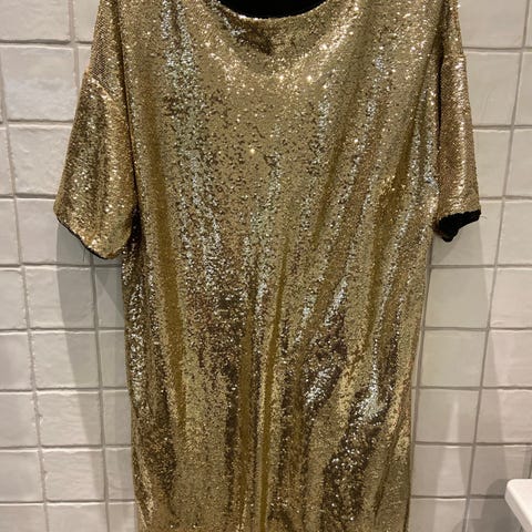 KappAhl festkjole i størrelse M. Kjolen har gullfarge og er laget av materiale med paljetter.