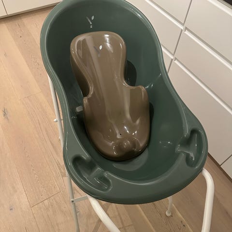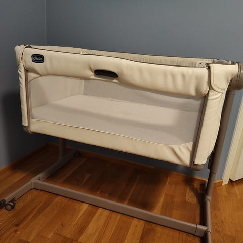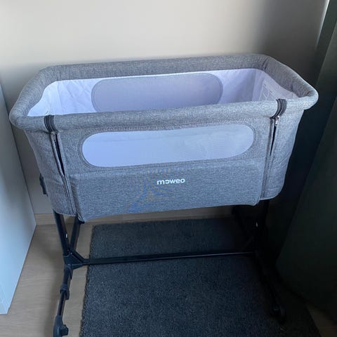 Selger en bedsidecrib fra moweo, noe misfarging på madrass og bak hodet på sengen, så trenger nok litt skrubbing, og den ene bremsen er noe løs, men ikke noe som har noe å si for bruken. Det følger også med stropper for å feste til foreldrenes seng.