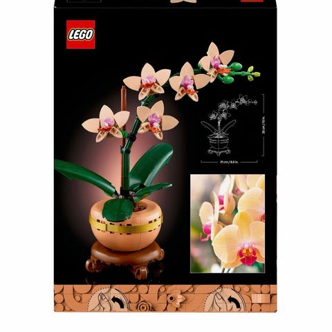 LEGO Orchid Blomsterdekorasjon består av 608 deler. Modellen viser en orkidé med hvite og rosa blomster, grønne blader og en svart potte. Settet er designet som en dekorativ modell.
