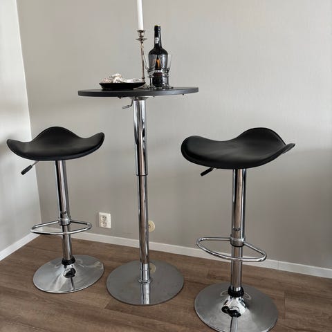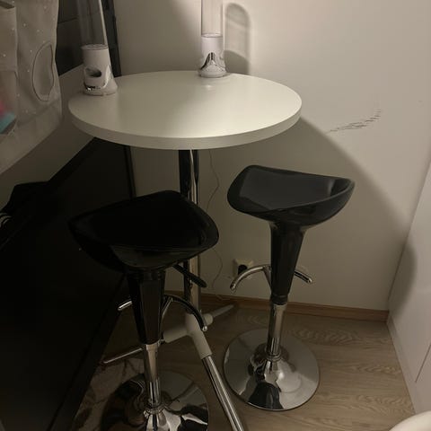 Veldig fin og praktisk bord med 3 barstoler. Stolene er i fin stand og justerbar i høyde. Passende ved siden av vinduet eller i kjøkkenet. :)