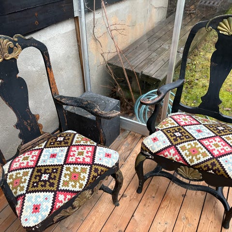 Selger 2 stoler som behøver litt oppussing. Stolene er uten store skader, kun slitte. Litt maling og oppussing så blir de fine igjen. De broderte trekkene er uten flekker og merker. Stolene har forskjellig design/dekor, se bilder.