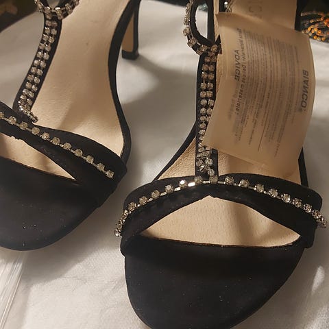 Buffalo Hæler i størrelse 39. Skoene har en åpen tå og flere tynne stropper over foten. Hælene er høye og tynne, med en glitrende overflate. Skoene har ankelstropp med spenne for justering.