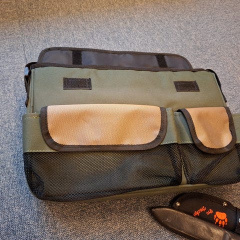 Abu Garcia fiskeveske i grå og svart farge. Vesken har flere lommer og justerbar skulderrem. Egnet for oppbevaring av fiskeutstyr eller andre småting under utendørsaktiviteter.
