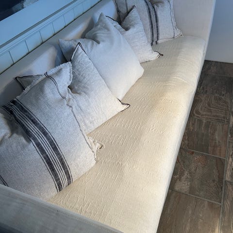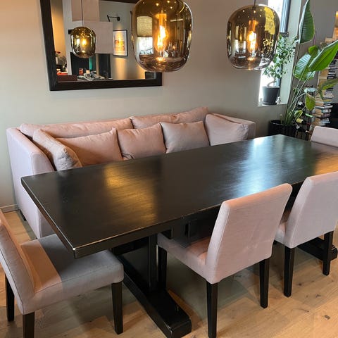 Scapa spisegruppe med 4-seters spisesofa og 4 stoler med høy rygg. Bein i sort bøk. Mål på spisesofa oppgitt på bilde. Kjøpt på Møbelringen Fagernes i 2023. Må hentes på Fagernes.