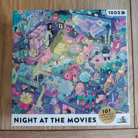 Night at the Movies puslespill med 101 brikker. Passer for barn og voksne som liker utfordrende og fargerike puslespill.