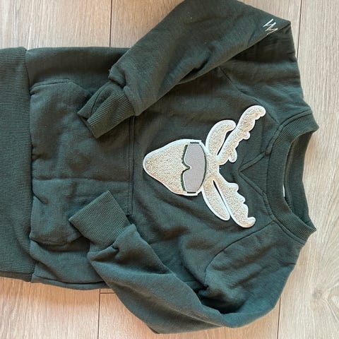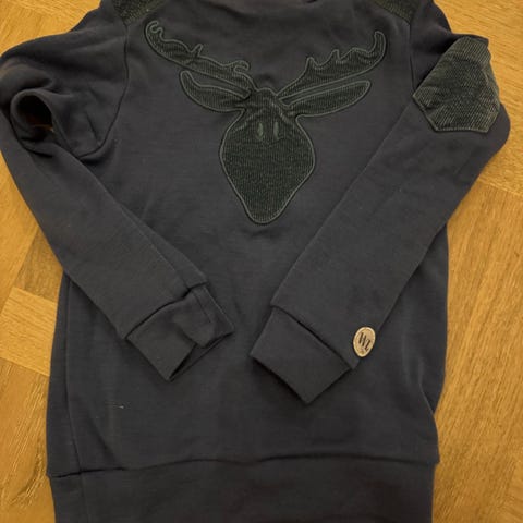 WoolLand ull genser for barn i størrelse 98/ 104. Har halv glidelås og et motiv med skiutstyr på fronten. Pent brukt, ingen anmerkninger