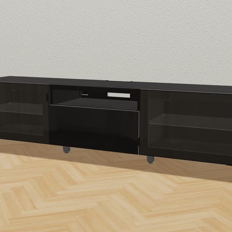 TV-benk basert på IKEA BYRÅS, med egenlagde dører trukket i høyttalerstoff. Dette gjør at lyd slipper godt gjennom og at TV-bokser, forsterker og annet utstyr fungerer optimalt selv med dørene lukket. Praktisk og stilren løsning som kombinerer oppbevaring med god lyd og funksjonalitet. Kabler kan trekkes gjennom baksiden.