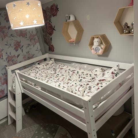 IKEA Busunge, Lekent design i sterke materialer med holdbare overflater og myke avrundede hjørner. Den er også uttrekkbar så den kan vokse i takt med barnet. Bredde 90cm (madrassbredde 80cm) og opptil 200cm lang.
