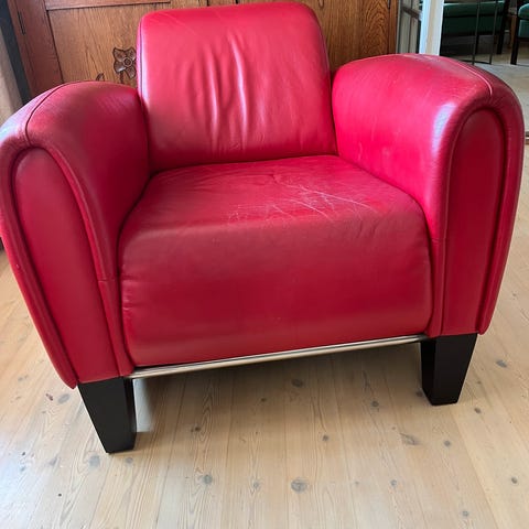 Brun skinnlenestol med polstret rygg med knappedetaljer og trearmstøtter. Stolen har en solid treramme og sete i skinn. Passer til bruk som spisestol eller kontorstol. I mahogni Meget stilig stol.