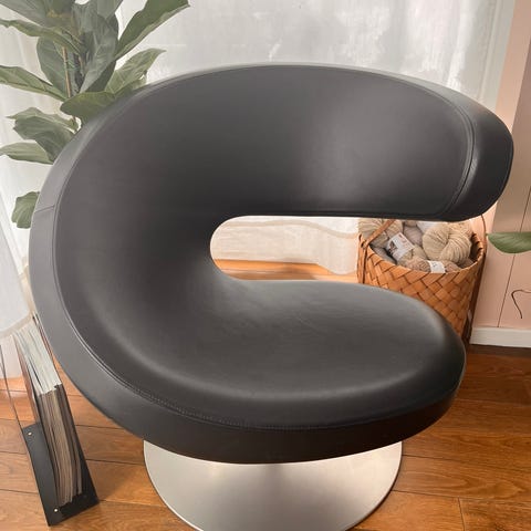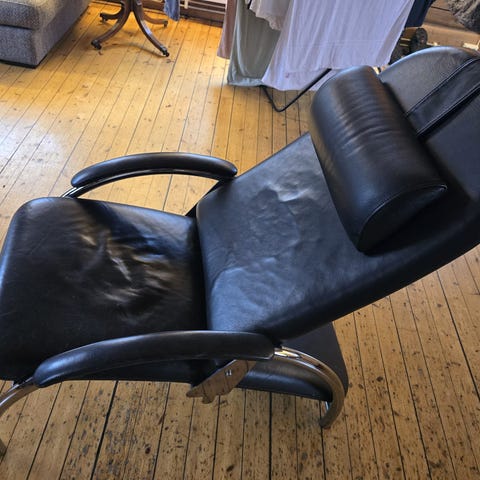 Brun skinnlenestol med knapper og trearmstøtter