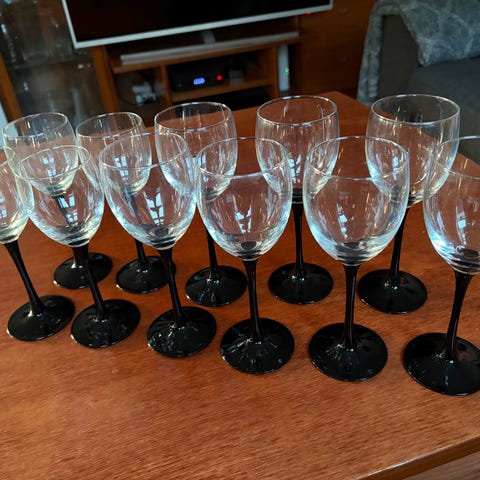 IVV Selezione glassett med sort stilk. Serien er produsert av IVV, en italiensk glassprodusent grunnlagt i 1952 i San Giovanni Valdarno, Toscana. Glassene er laget med tradisjonelt håndverk kombinert med moderne design, og har munnblåst glass som gir et unikt utseende. Settet inkluderer forskjellige typer glass med sort stilk.