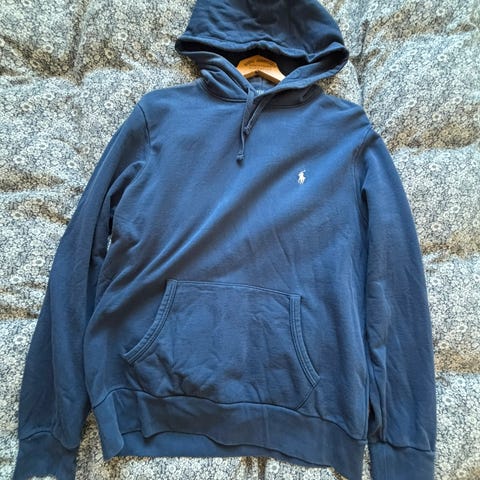 Ralph Lauren hoodie genser i blå farge, størrelse M. Genseren har en gul brodert logo på brystet og er laget for menn. Pent brukt!