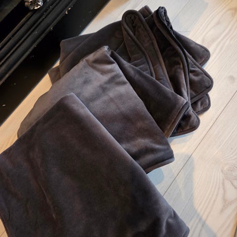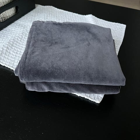 Selger 1 stort blått og 1 vanlig sort putetrekk i velour til 30,-.