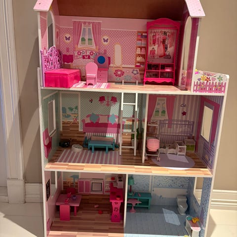 Pent og lite brukt dukkehus med tre etasjer.
