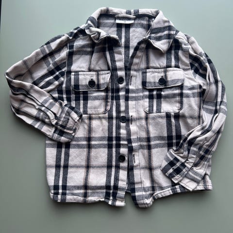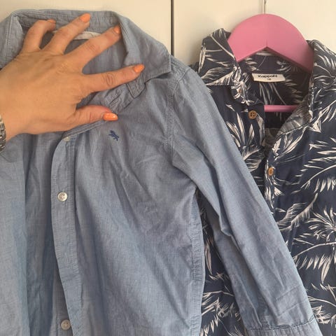 KappAhl skjorte i blå bomull med hvite striper, størrelse 110 for gutt. Skjorten har knappelukking foran og mansjetter med knapper.