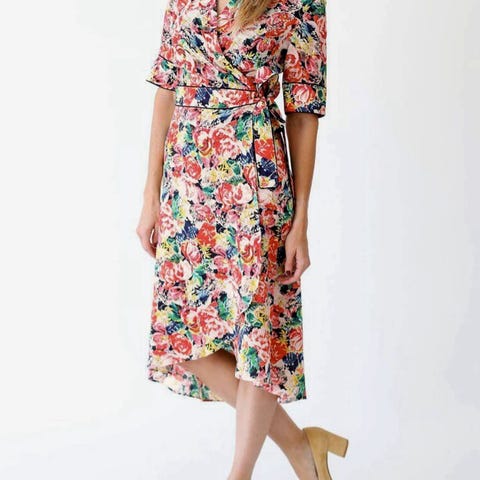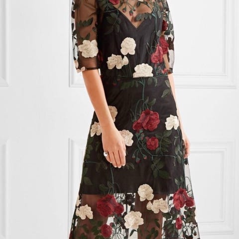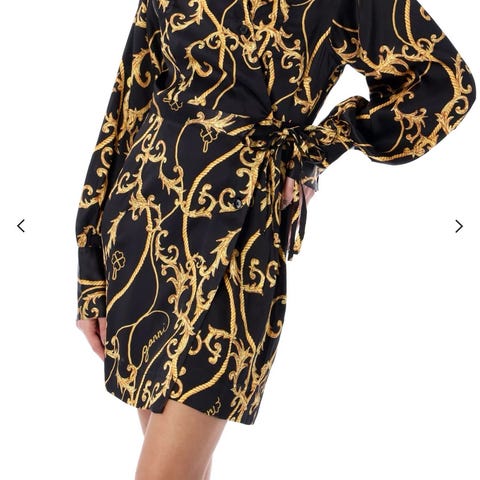 Ganni blomsterkjole (rekker til ca midt på leggen, jeg er 168 høy) i 92 % silke. Flatterende på.