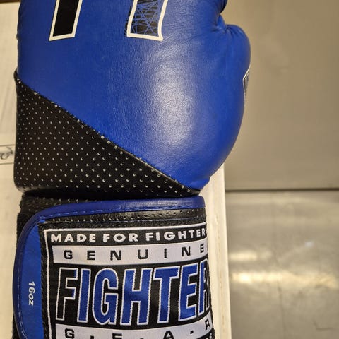 Fighter treningshansker i svart farge. Hanskene har ventilasjonshull og borrelåsfeste for justering. Egnet for kampsport og boksing. Pent brukt, helt funksjonelle, men litt avflassing på innsiden (se bilder). Str. XS. Selges for 200 kr.