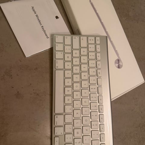 Apple Magic Keyboard tilleggsutstyr i hvit og sølvfarge. Trådløst tastatur med kompakt design, beregnet for bruk med Apple-enheter. Tastaturet er laget i aluminium og plast, og tilbyr et lavt profil tastaturoppsett.