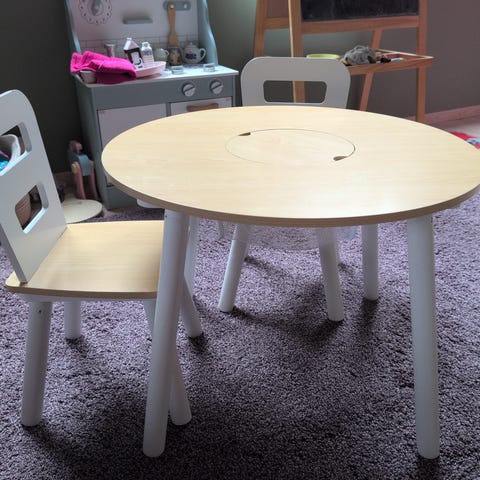 Mutable og 3 stoler som kan justeres i 3 forskjellige høyder. Oppbevaringspose og et glass for skrivesaker. Bord har 3 tosidige plater: kritt/hvitt, lego/duplo, trafikk/natur.