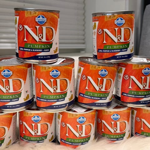 Selger tre åpne sekker med N&D-fôr for små hunder.