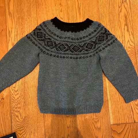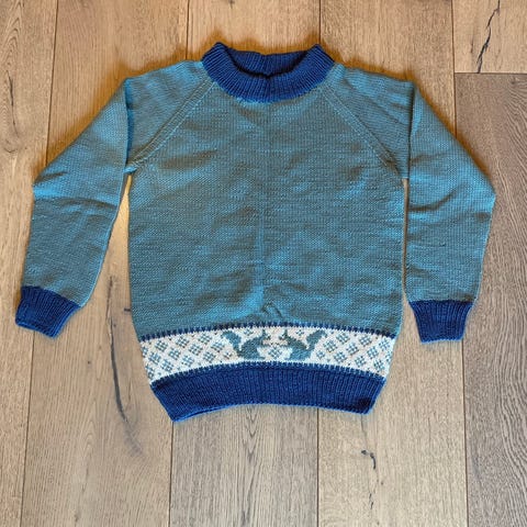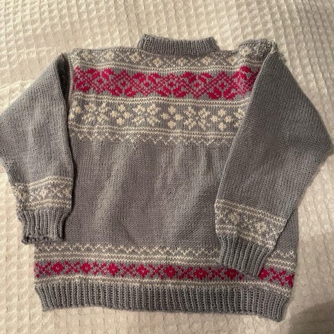 God og varm hjemmestrikket ullgenser i offwhite, lys grå og koksgrå, med mørkerøde felt nederst på ermene og øverst på halsen.