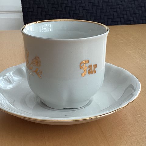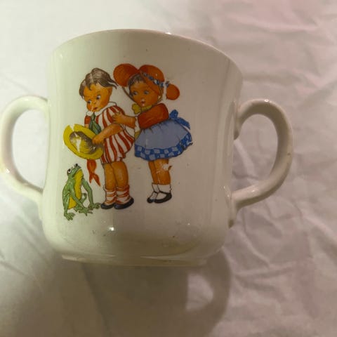 Eldre puppekopp i stengods. Den er ca 9cm høy. Noe slitasje.