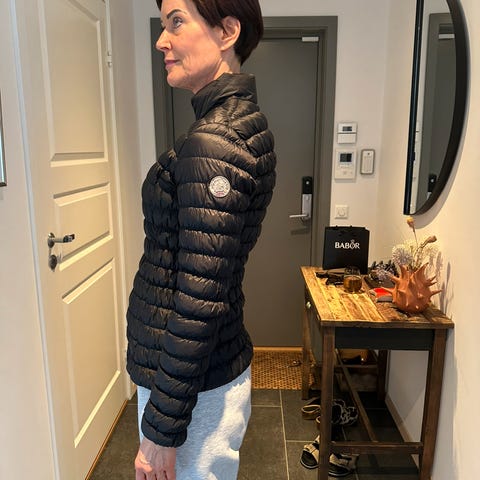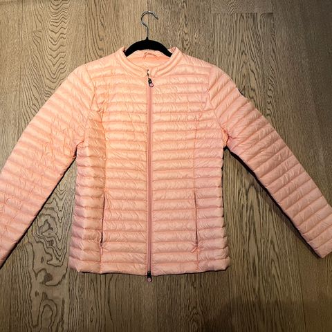 Klassisk lett dunjakke selges! Lav krage og to skrå lommer i front som lukkes med knapper. Fargen er nydelig og unik.