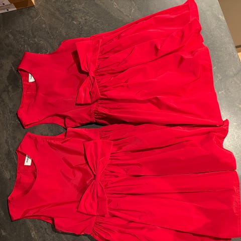 Rød nisse/ julekjole for barn i størrelse 98/104, Kjolen har hvite detaljer på krage og ermer, og er laget av fløyelsmateriale. Pent brukt, ingen bruksmerker.