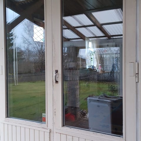 Glassdør med sølvfarget metallhåndtak og låsesylinder. Døren har glassfelt som gir gjennomlysning. Passer til innvendig bruk. Lende 204 cm bredde 74 cm.