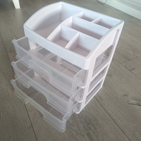Sminkebord med glassplate og to skuffer for oppbevaring av sminke og kosmetikk. Egnet for organisering av ulike skjønnhetsprodukter. Speil selges separat for 250kr.