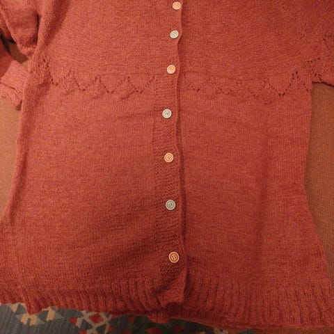 Pen strikkejakke med skjørtekant nederst i fargene rødt, svart og hvitt. Også med bånd