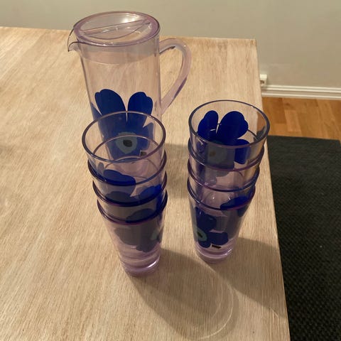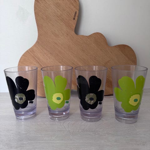 4stk drikkeglass (plast) med Unikko blomst i grønn. Produsert av Zak Design. Godt brukt med riper.