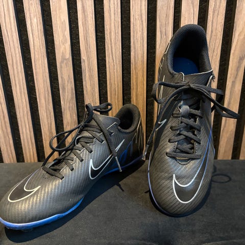 Nike Vapor Edge Pro 3 fotballsko for barn i størrelse US 3Y (EUR 35). Skoene er hvite med svarte og røde detaljer, laget for fotball med knotter under sålen for godt grep på gressbaner.