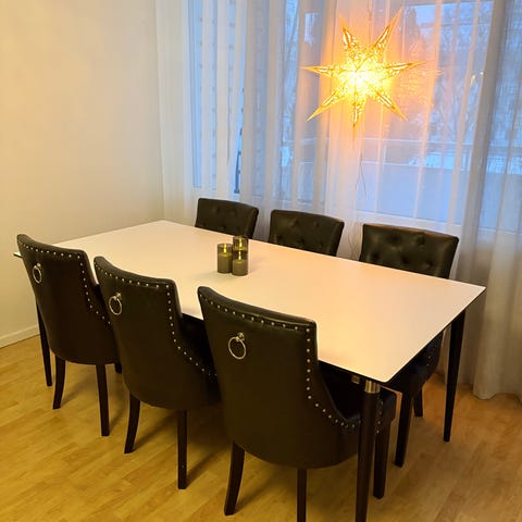 Bordet trenger å stabiliseres med et skruefeste, da det er noe ustødig. Bordet har også fått en liten neglelakkflekk.