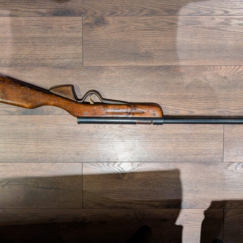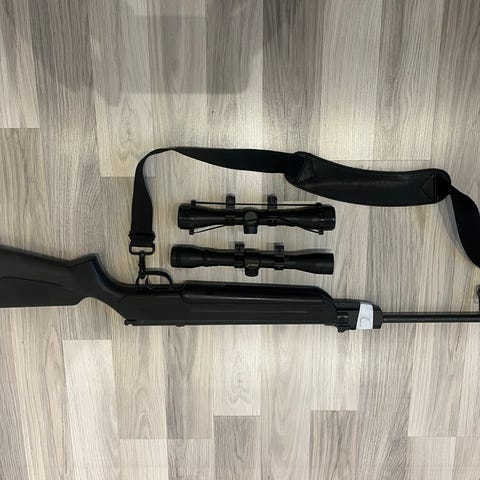 Luftgevær med lyddemper,orginalt kikkertsikte og rødpunkt sikte.Omtrent 100 skudd avfyrt.Bare til personer over 18 år .Må hentes selv